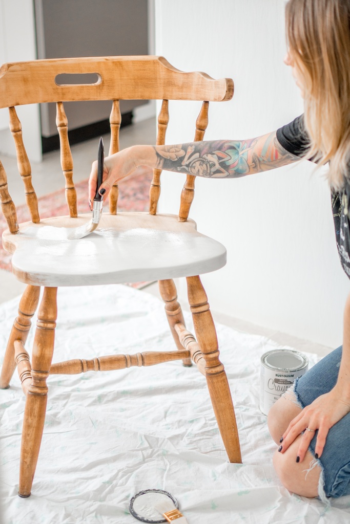 Cette étape est optionnelle avec du chalk paint, mais j’ai préféré sabler la chaise quand même parce que ne voulais pas que la couleur du bois rougeâtre ressorte quand j’allais lui donner son look usé à la fin.
